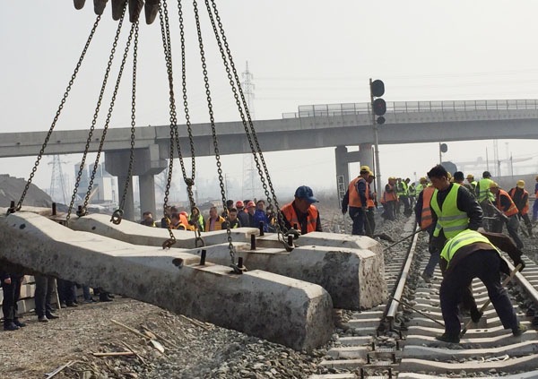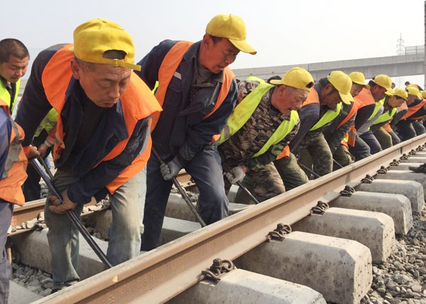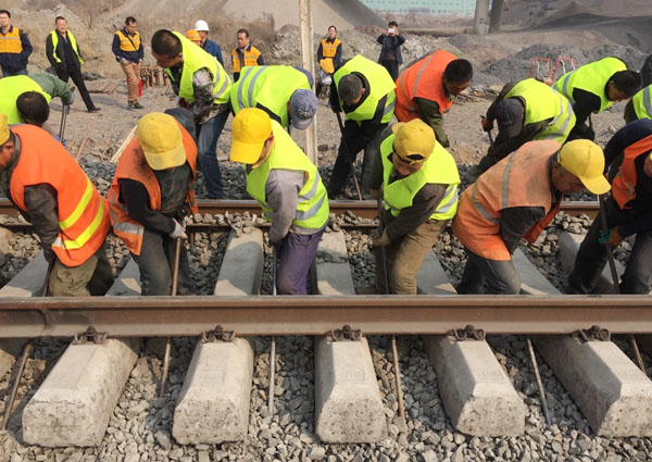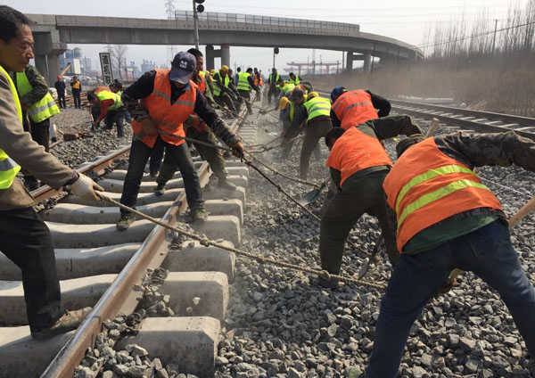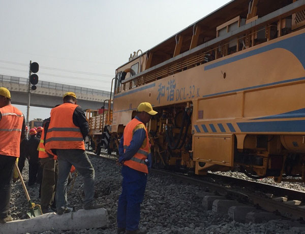 集團(tuán)組織施工人員140人和路局各相關(guān)站段參加本次轉(zhuǎn)線會(huì)戰(zhàn),本鋼主管領(lǐng)導(dǎo)及集團(tuán)主要領(lǐng)導(dǎo)親臨現(xiàn)場(chǎng)指揮。轉(zhuǎn)線就是鐵路新建線路和既有線路的無(wú)縫對(duì)接,鐵路轉(zhuǎn)線要求在規(guī)定的施工天窗內(nèi)完成。參加會(huì)戰(zhàn)的工人們?cè)诩儤愕摹拌F路號(hào)子”聲中熟練的撬鋼軌、鋪軌枕、上碴石,每道程序分工明確,各個(gè)施工節(jié)點(diǎn)嚴(yán)格控制,分秒必爭(zhēng),場(chǎng)面十分壯觀,只有身在現(xiàn)場(chǎng)的人們才能體會(huì)到什么是“熱火朝天”的真正寓意。剛剛成型的新建線路經(jīng)大型搗固工程機(jī)車(chē)“兩搗一穩(wěn)”自動(dòng)檢測(cè)數(shù)據(jù)顯示,線路質(zhì)量達(dá)到列車(chē)運(yùn)行標(biāo)準(zhǔn),于15時(shí)05分首列客車(chē)安全、準(zhǔn)點(diǎn)通過(guò)新建路段。