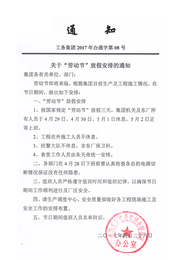 工務集團2017年辦通字第08號《關于“勞動節(jié)”放假安排的通知》