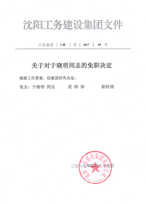 工務集團(人事)字【2017】09號《關于對于曉明同志的免職決定》