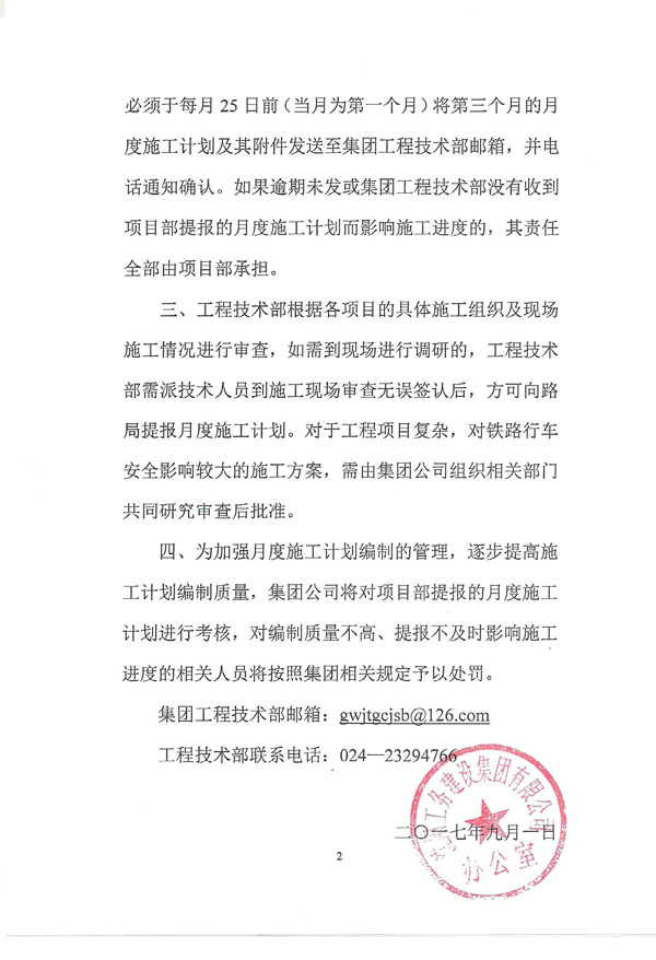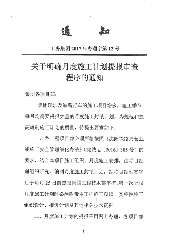 工務集團2017年辦通字第12號《關于明確月度施工計劃提報審查程序的通知》