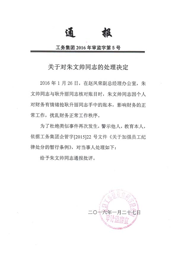 工務(wù)集團2016年審監(jiān)字第5號《關(guān)于對朱文帥同志的處理決定》