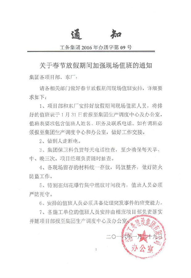 工務集團2016年辦通字第09號《關于春節(jié)放假期間加強現場值班的通知》